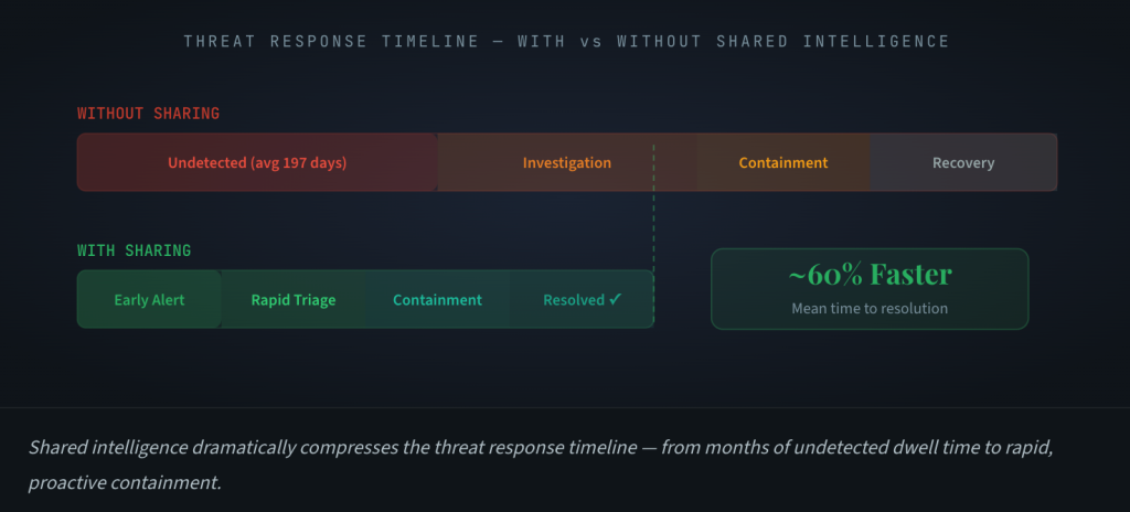 - Faster response, less damage. Organizations in active sharing programs consistently demonstrate shorter dwell times and reduced incident impact.